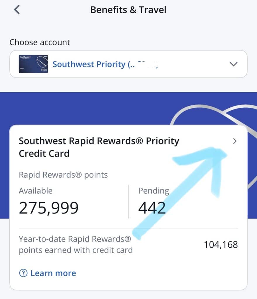 First you'll need to log in to the app or website and select your specific Southwest card.