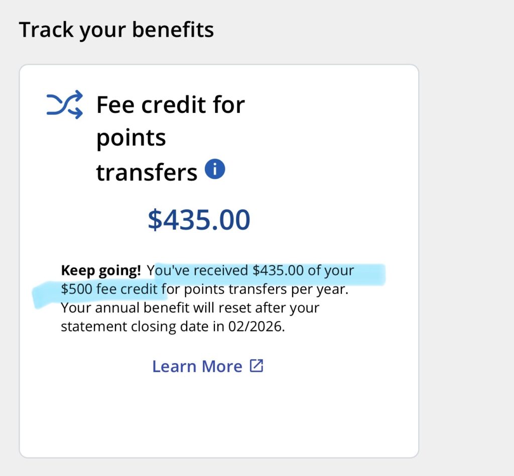 I followed the same process for my Premier business card and can see that my Fee credit for points transfer is almost used up, I have used $435 of $500. It states that my annual benefit will reset in 2/2026 but this is actually incorrect since this benefit is being discontinued 12/31/2025.