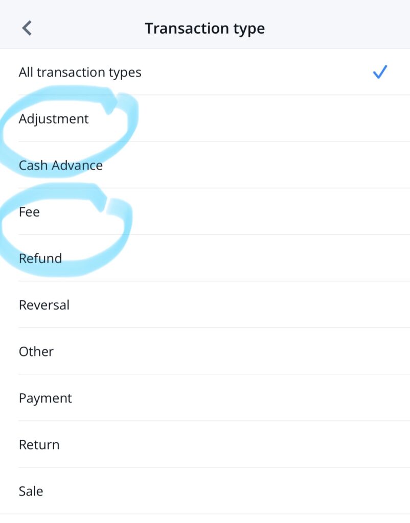 Then it lets me filter for "Adjustment" and "Fee" — you need to do these one at a time.