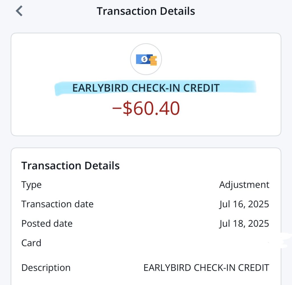 But when I clicked into the transaction detail, I could see that this was for my Early Bird Check-In Credit.
