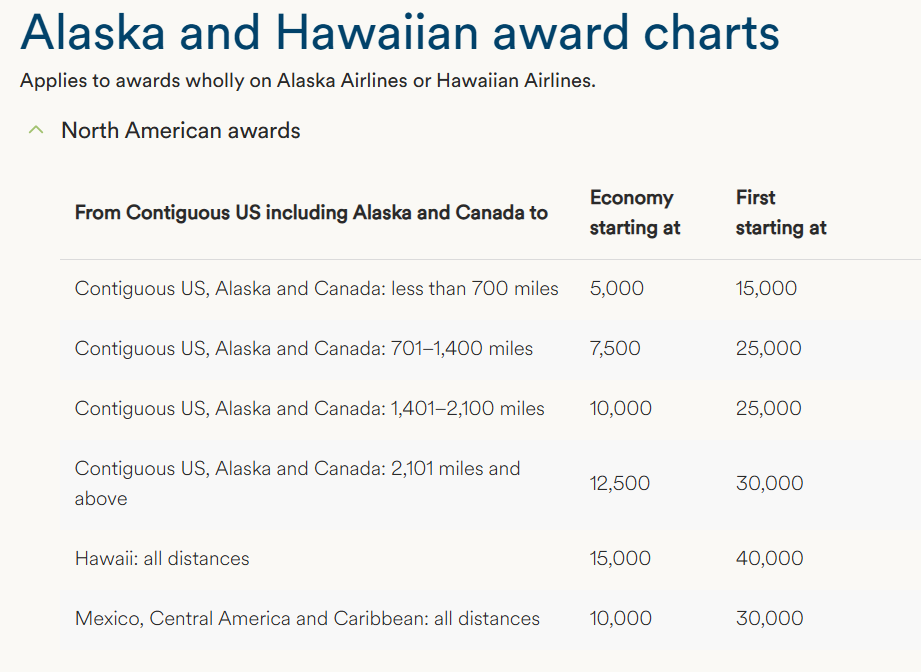 This is the chart for flights operated by Alaska Airlines and Hawaiian Airlines. There are separate award charts for partner airlines to several regions of the world.