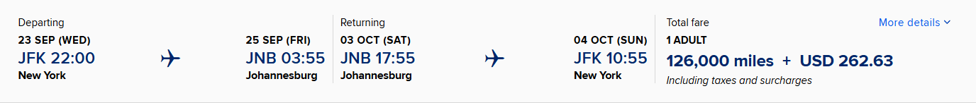Singapore Booking Example: New York JFK to Johannesburg JNB (on Ethiopian Airlines and Turkish Airlines) 126,000 miles + $262