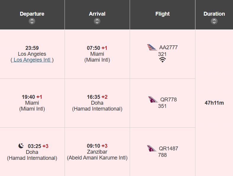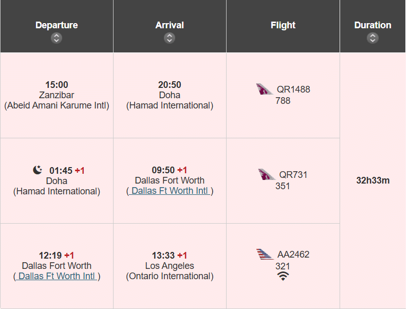 Japan Airlines Booking Example: LAX-ZNZ (on American and Qatar) 120,000 + $253