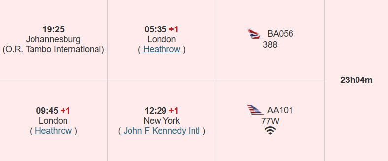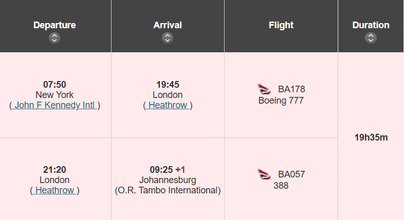 | British Airways | JFK to JNB | 110,000 | $594 |