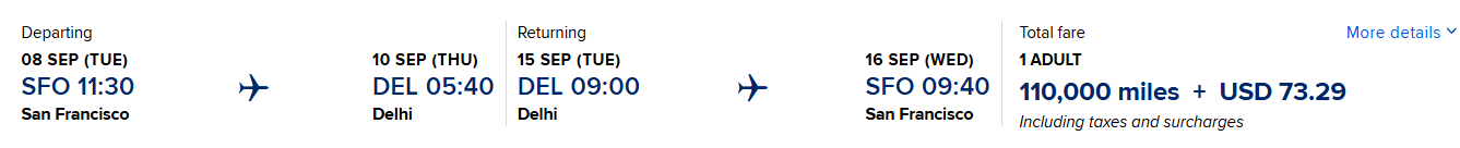 Aeroplan Booking Example: SFO to DEL (on Air Canada) 110,000 miles + CA $157