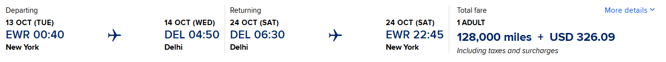 ANA Booking Example: JFK to DEL (on United and ANA) 80,000 miles + $375