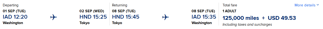 Singapore Booking Example: IAD-HND (flying on United) 125,000 +$49