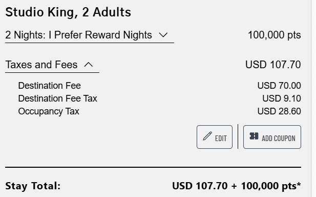 I Prefer Reward Nights are booked fully on points. The only cash you’ll need to pay is any resort fees or taxes that are not otherwise included (additional fees are always shown on the search page and the checkout screen, more on that below).