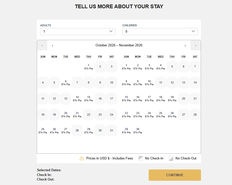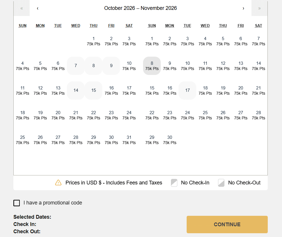 When looking at the hotel calendar, it sometimes appears that rooms are available when they’re not. To make sure there are actually rooms available, select your dates, then click “continue”. If you are able to select a room type, then that means rooms are indeed available and bookable with points.