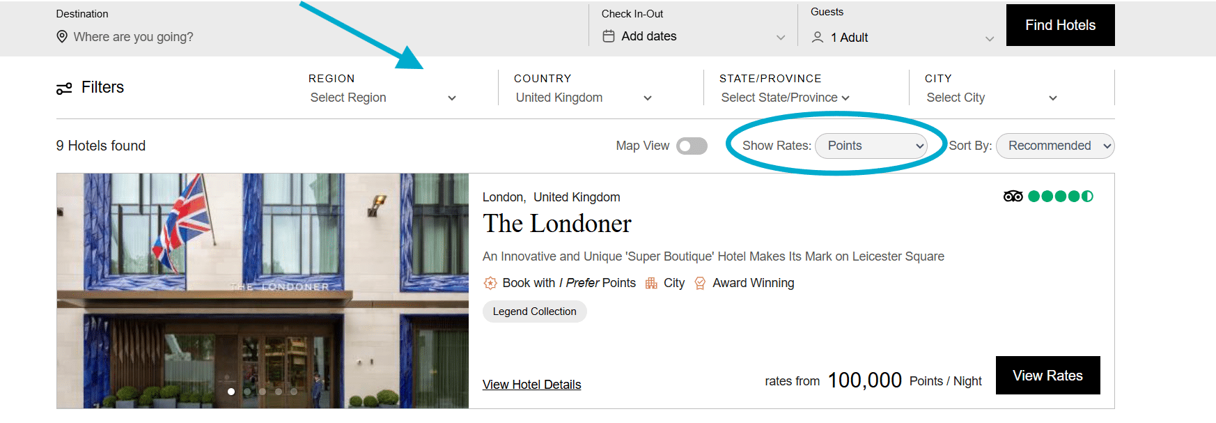 That’s why we suggest filtering down to a city and clicking “View Rates” from there, rather than searching for a hotel by name.