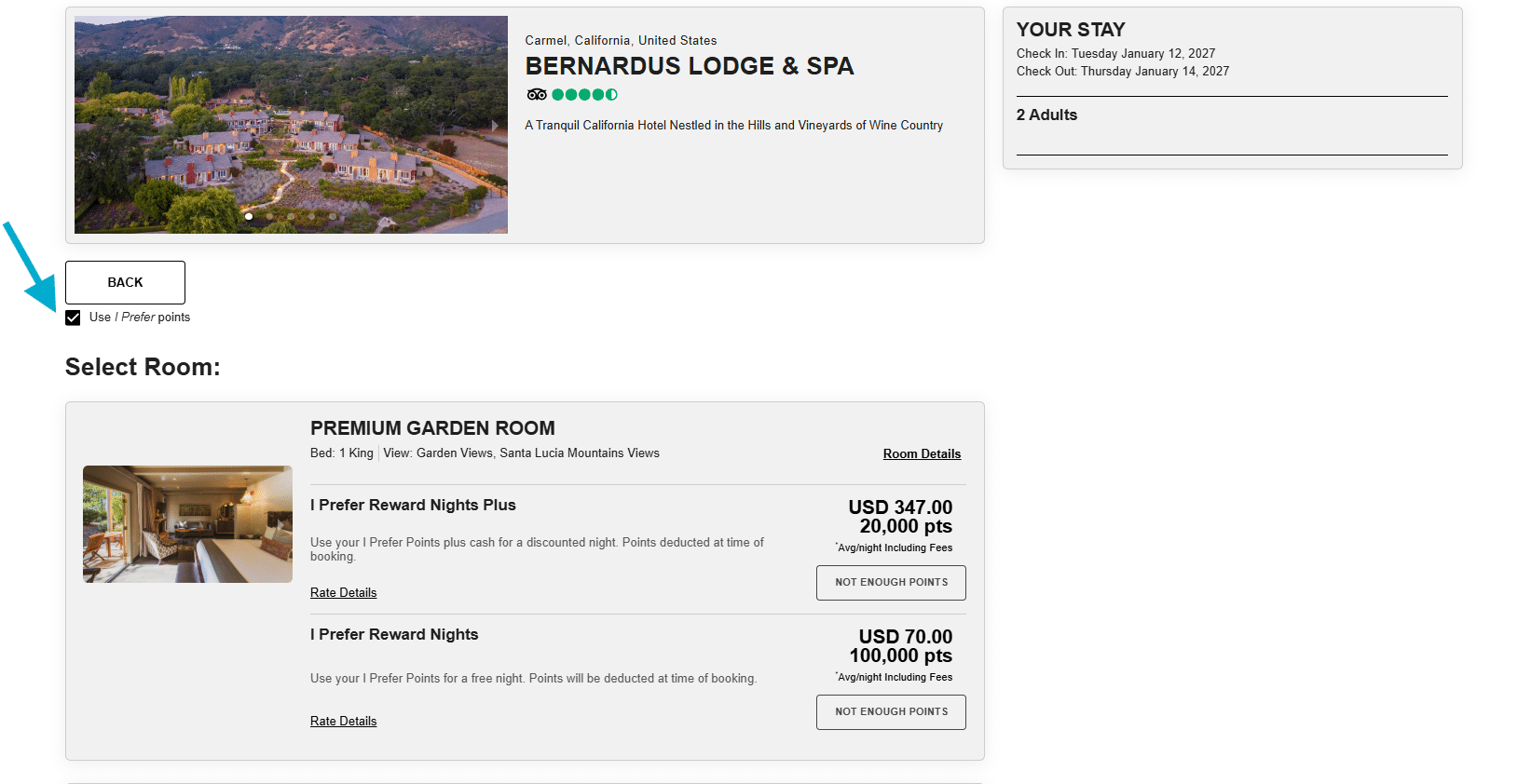 If you’re logged in but you don’t have enough points in your account to cover the booking, you sometimes won’t be able to move past this screen. Instead of the “select” button, you’ll see a note that says “not enough points”. If this happens, you should be able to log out, then run the search again.
