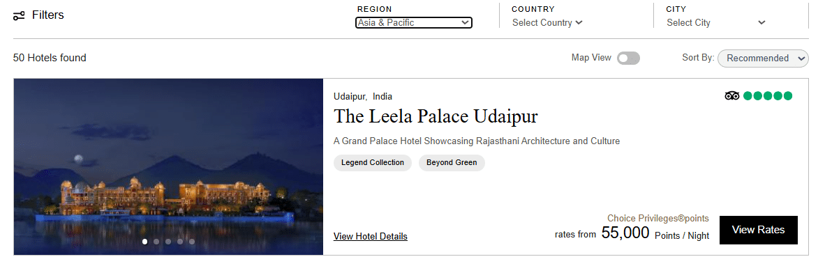 The search page is very similar to what you see when searching through I Prefer. You can filter by region, country, or city. In this screenshot, I’ve narrowed the results to Asia & Pacific. You can view the results as a list or on a map.