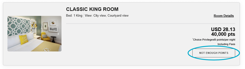 After selecting dates and clicking “continue”, you’ll get to a page where you can select a room. If you don’t have enough points in your account, you’ll see a button that says “not enough points”.