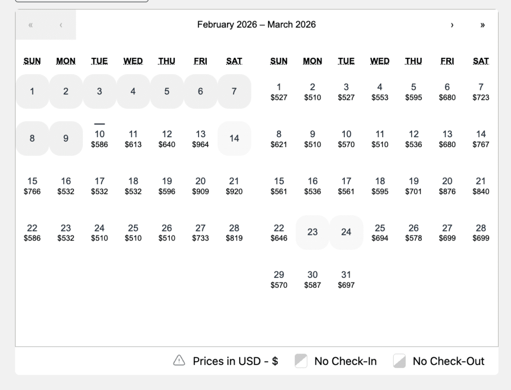 Click on “View Rates” to see a calendar of availability at each hotel. From there, you can select dates and choose a room.