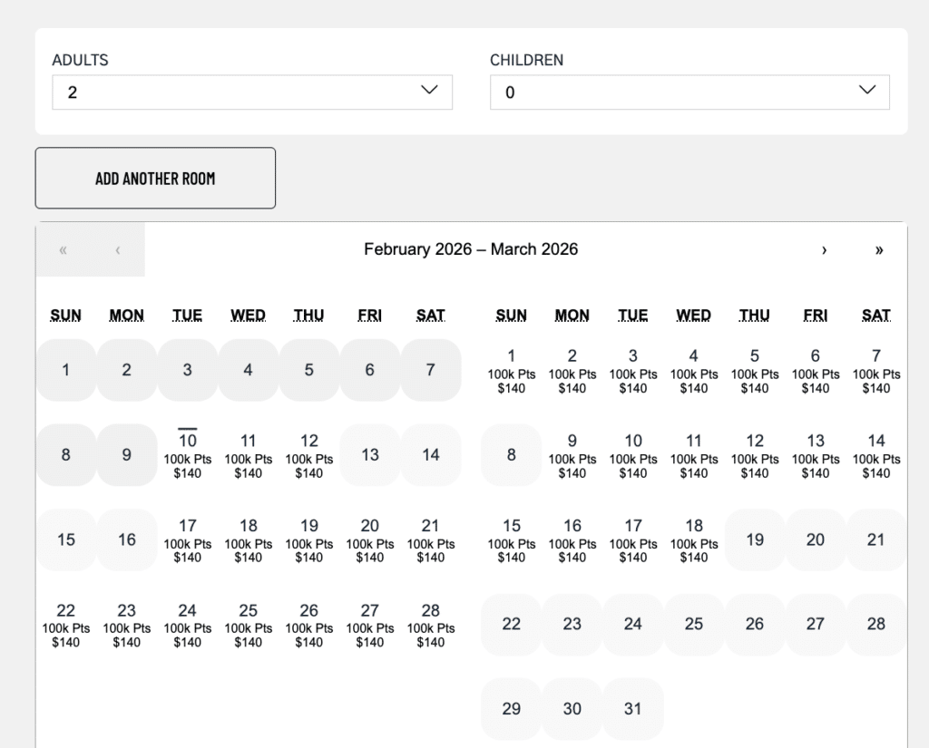 But note that some hotels with an occupancy of 4 can’t always be booked for 4. For instance, if all the standard two queen rooms are booked, a hotel might not be bookable for 4 people. There’s no way to force the points calendar to show which dates have rooms for a certain occupancy.