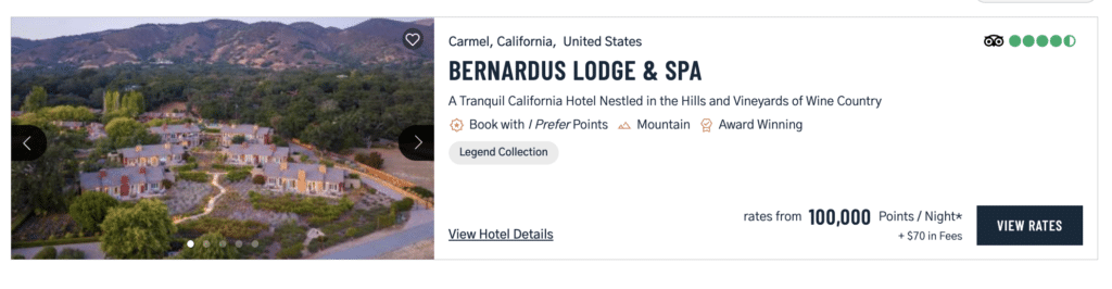 When I searched for the Bernardus Lodge & Spa using the search bar at the top of the page, I could only get to this calendar with cash prices