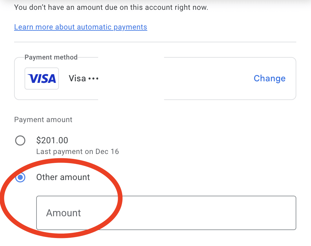 Then select to pay "Other amount" and enter in $200 (or however much of the credit you have remaining). Be sure to change payment method to your Sapphire Reserve for Business.