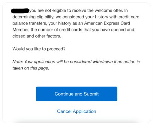 If you're not eligible to receive a welcome offer, you'll get a pop-up message letting you know. The message will look something like this: