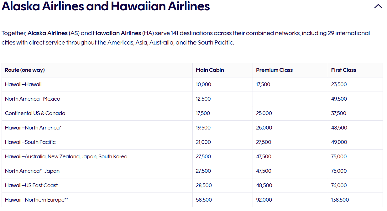 Here’s the Finnair partner award chart for flights on Alaska Airlines and Hawaiian Airlines: