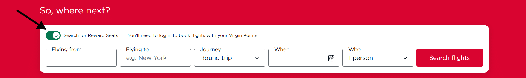 Go to VirginAtlantic.com and sign in. On the search page, select the toggle button where it says “Search for Reward Seats”, then input your cities and departure date. You can search for either one way or round trip, but it’s typically easier to search for one way at a time.