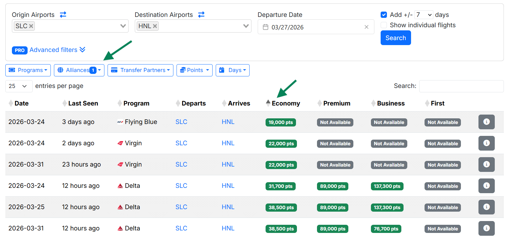 You can sort the results using the up and down arrows on the bar above the search results. In this screenshot, I’ve selected to sort the results according to the lowest economy prices, but you can also sort by date, program, airport, and more.